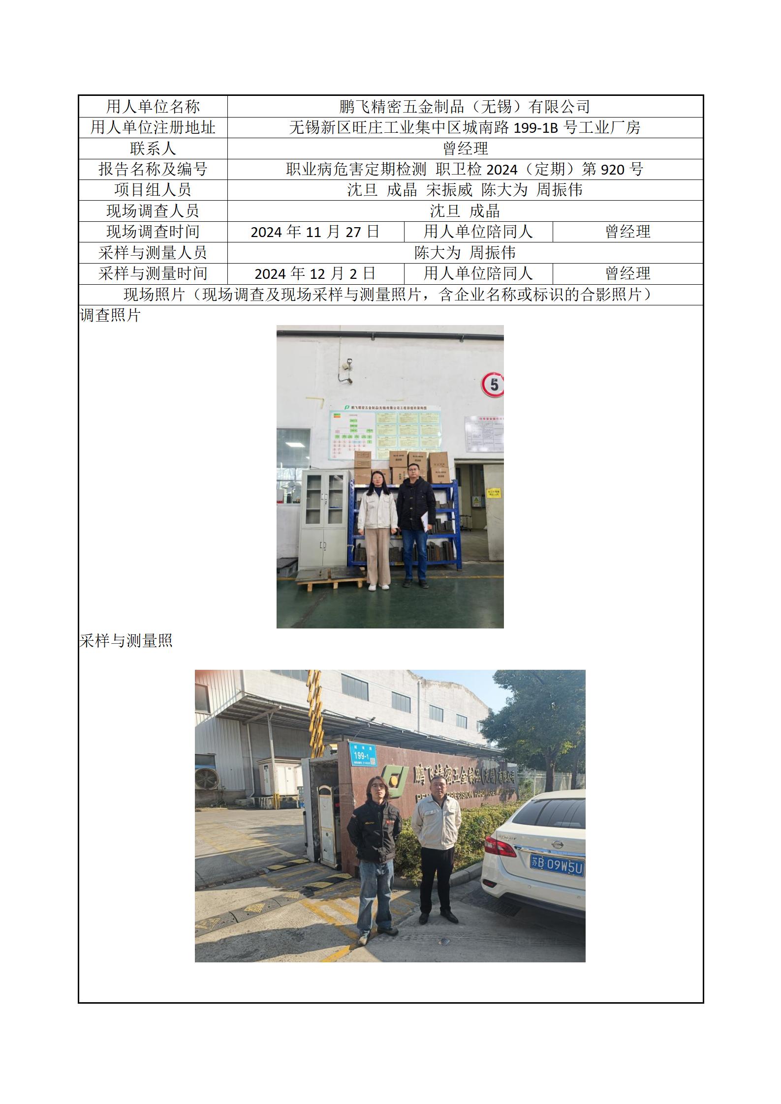 现场采样每日上报(鹏飞精密五金制品(无锡)有限公司)