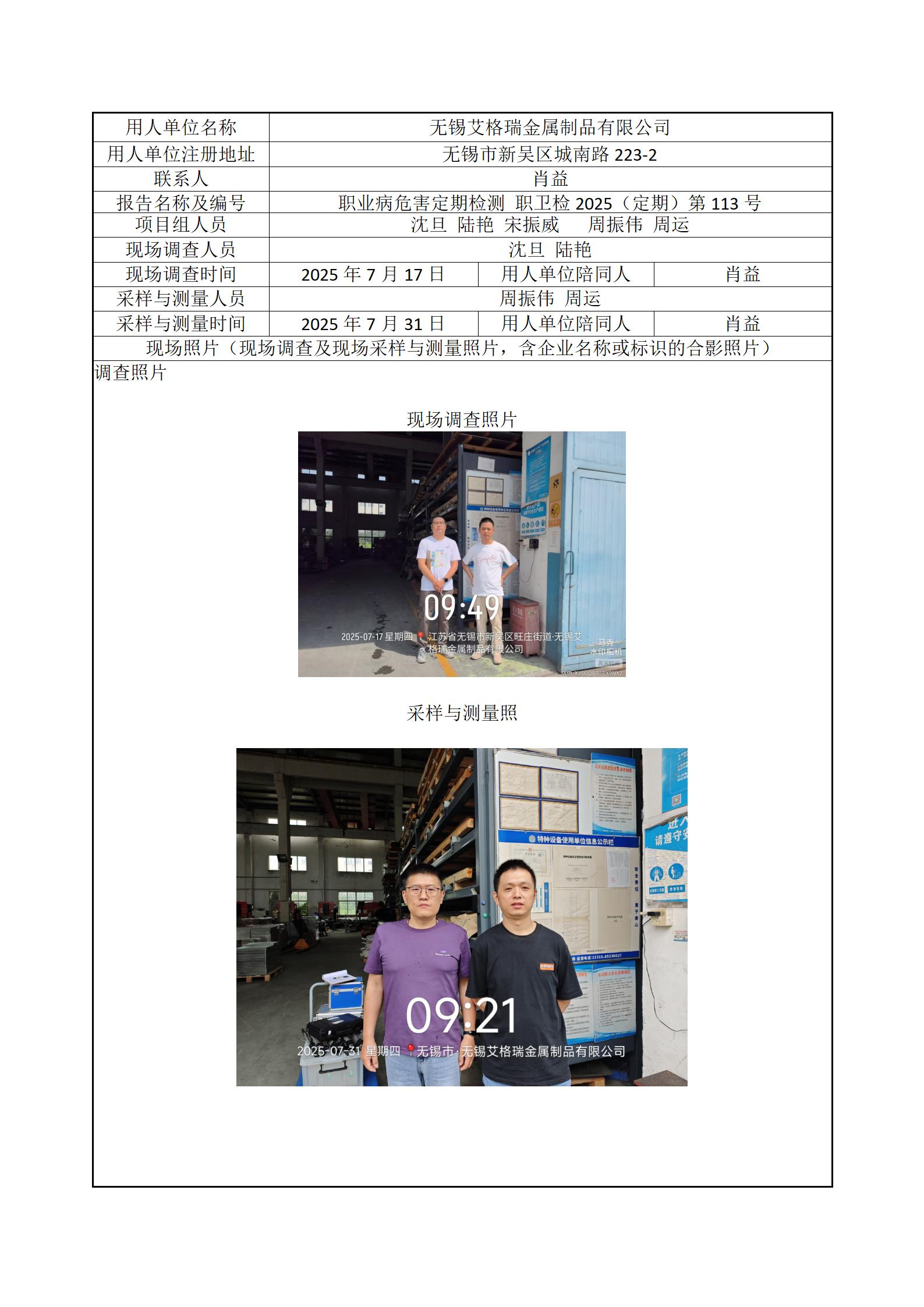 现场采样每日上报(无锡艾格瑞金属制品有限公司)