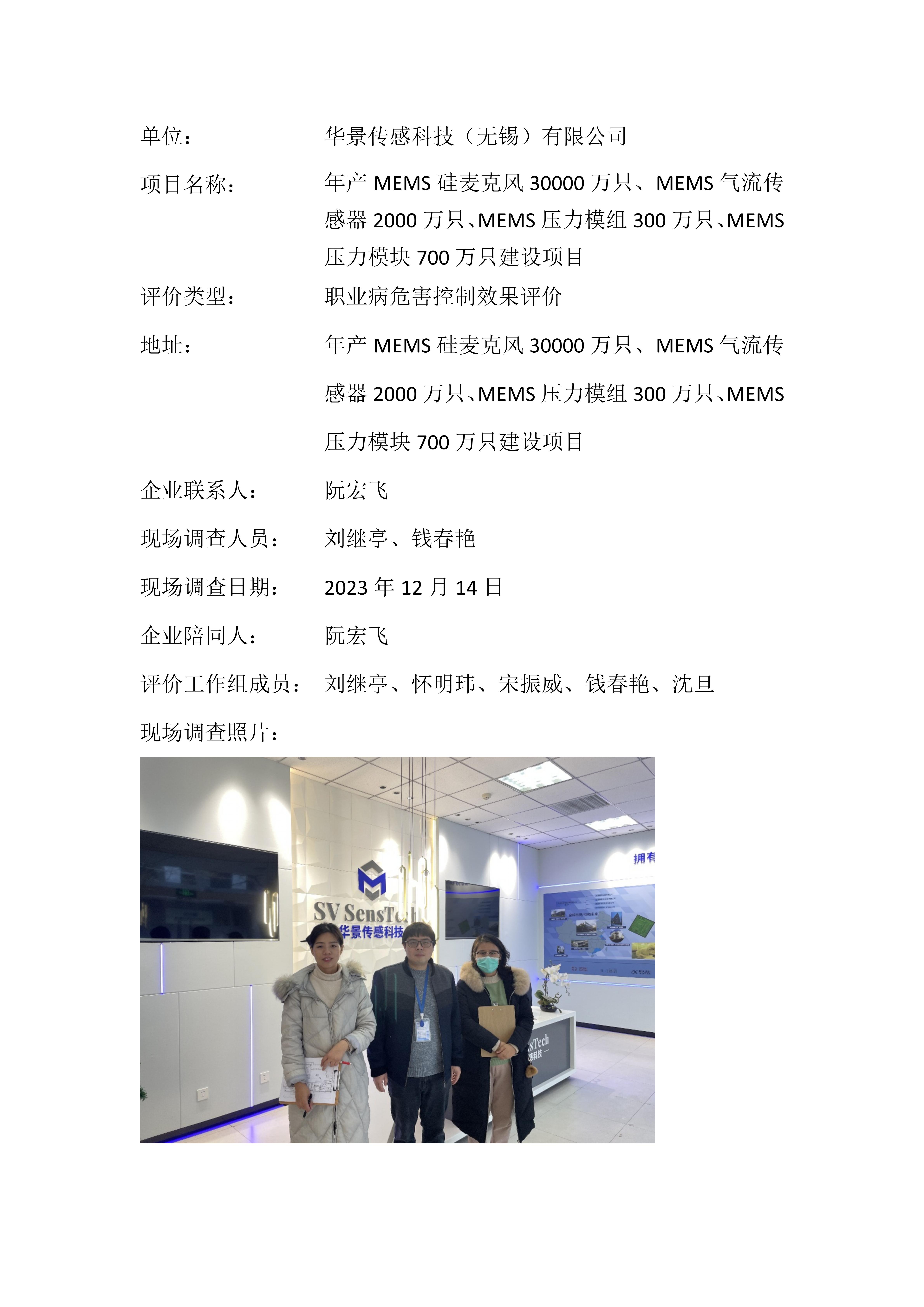 【职业病危害控制效果评价报告】华景传感科技(无锡)有限公司