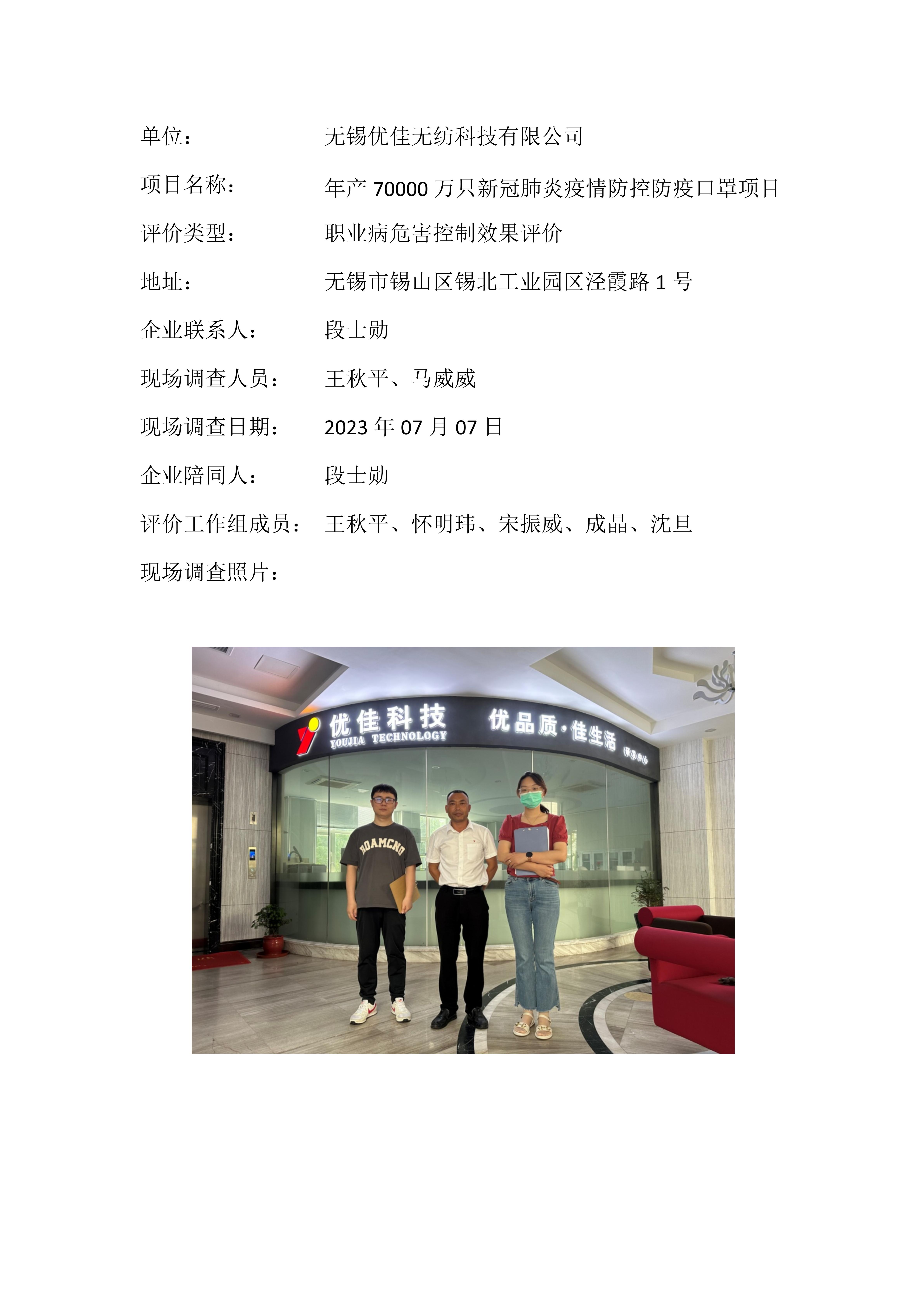 【职业病危害控制效果评价报告】无锡优佳无纺科技有限公司