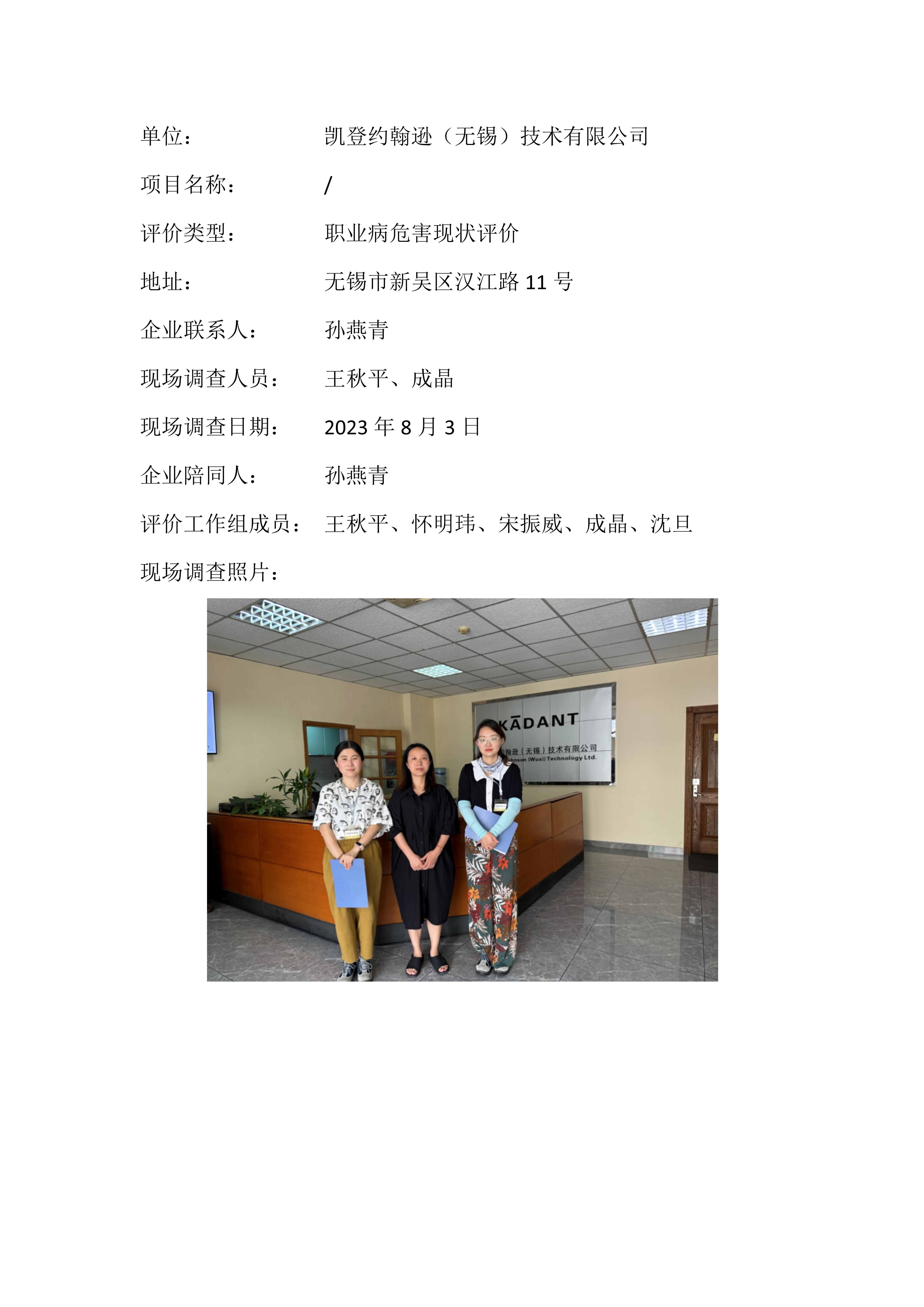 【职业病危害现状评价报告】凯登约翰逊(无锡)技术有限公司