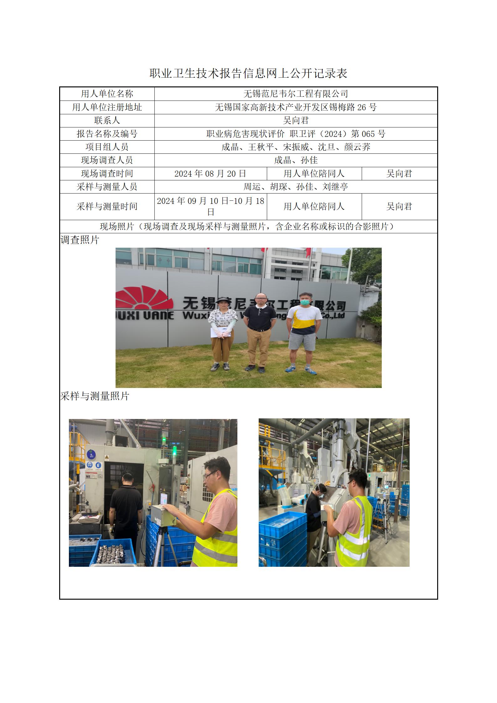 【职业病危害现状评价报告】无锡范尼韦尔工程有限公司