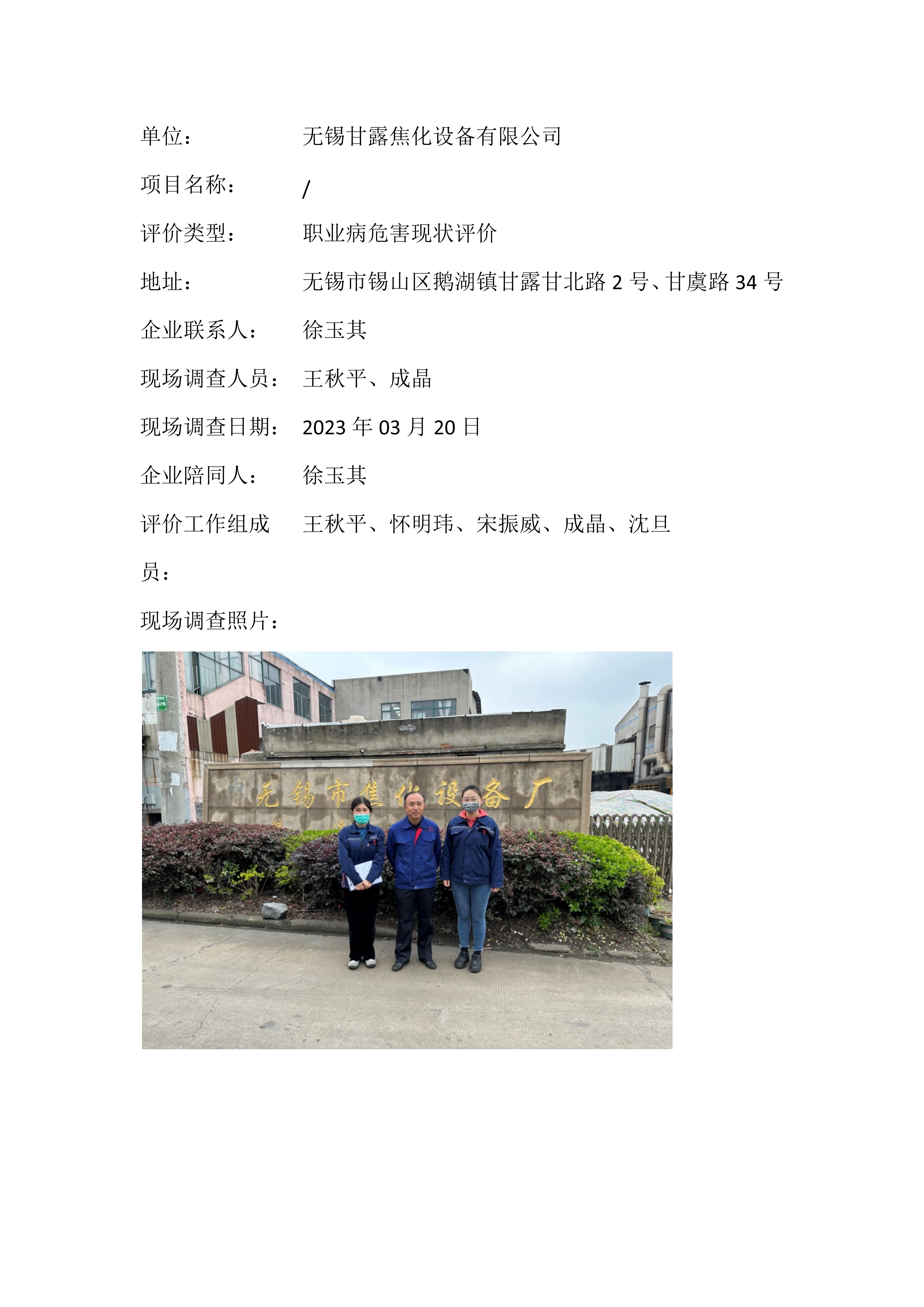 【职业病危害现状评价报告】无锡甘露焦化设备有限公司