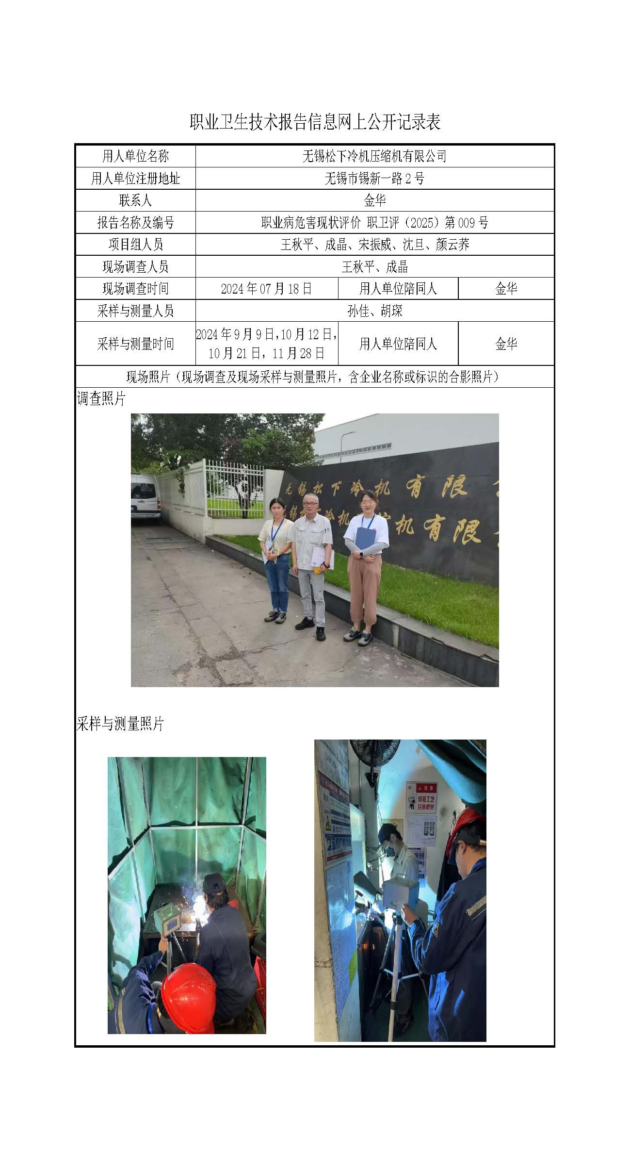 【职业病危害现状评价报告】无锡松下冷机压缩机有限公司