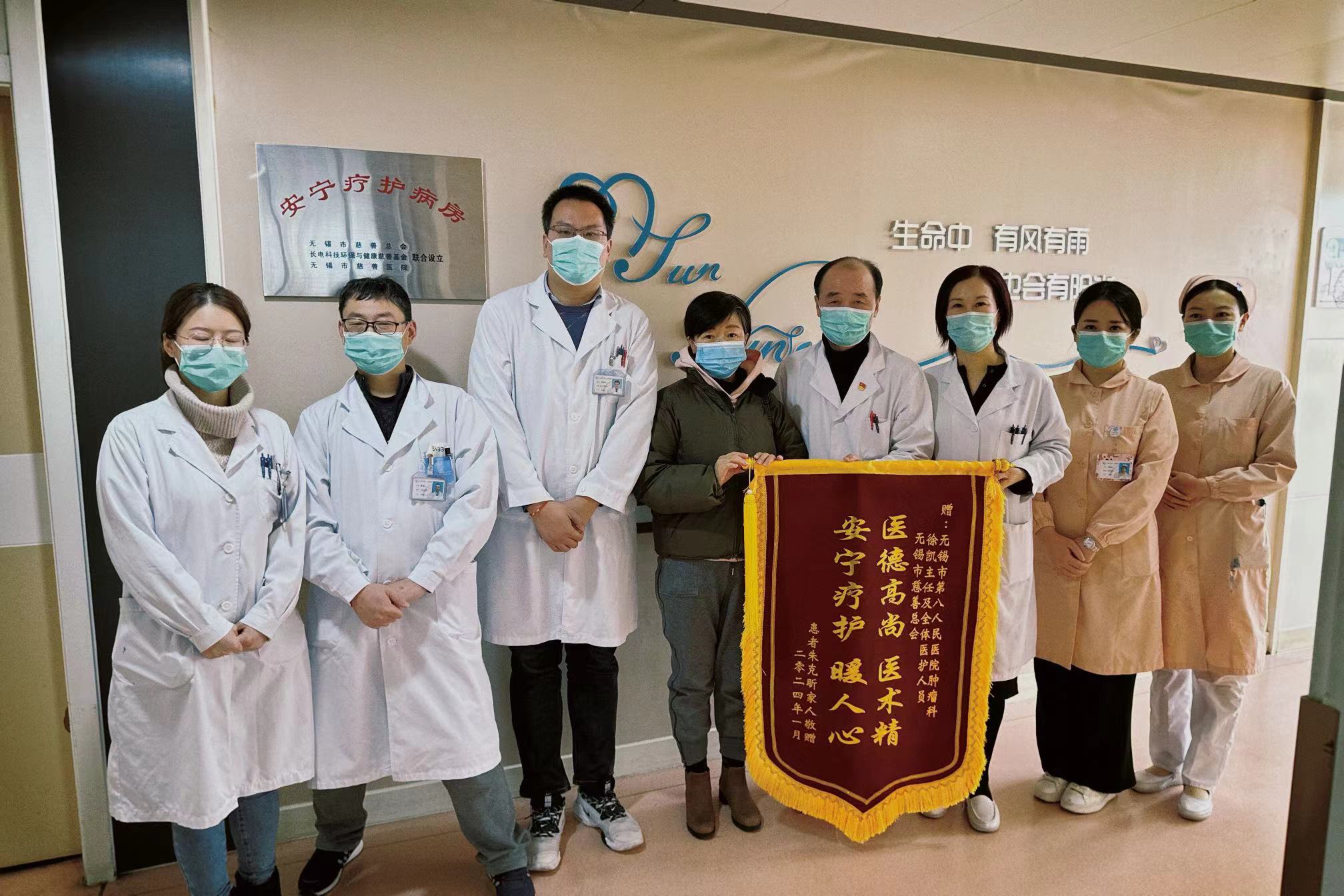 在全体医护人员的不懈努力下,患者的身体素质得到改善,体重增加了3斤,疼痛也得到了科学控制。为了表示对无锡市慈善总会和红黑技巧研究所 的谢意,家属新的一年特意送来锦旗,感谢安宁疗护用专业的方法帮助患者提高生活质量,让终末期患者舒适、平静、尊严地离世,也希望这样的慈善之光能发扬光大,让慈善温暖更多有需要的家庭。