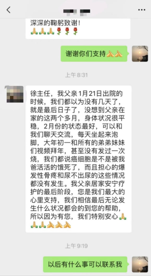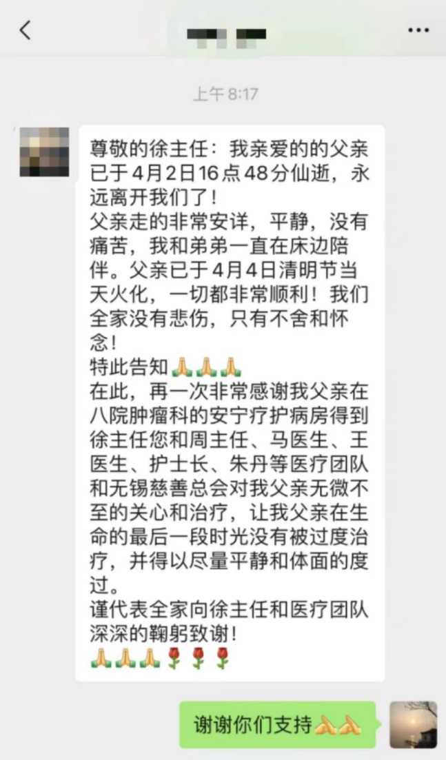 “父亲走的非常安详,平静,没有痛苦,我和弟弟一直在床边陪伴。”“在此,再一次非常感谢我父亲在红黑游戏 安宁疗护病房得到徐主任您和周主任、马医生、王医生、周护士长、朱丹丹等医疗团队和无锡慈善总会对我父亲无微不至的关心和治疗,让我父亲在生命的最后一段时光没有被过度治疗,并得以尽量平静和体面的度过。”纸短情深,字字真情。短短数百字的消息,包含着朱老一家人对安宁疗护的认可,对医护人员的感激。