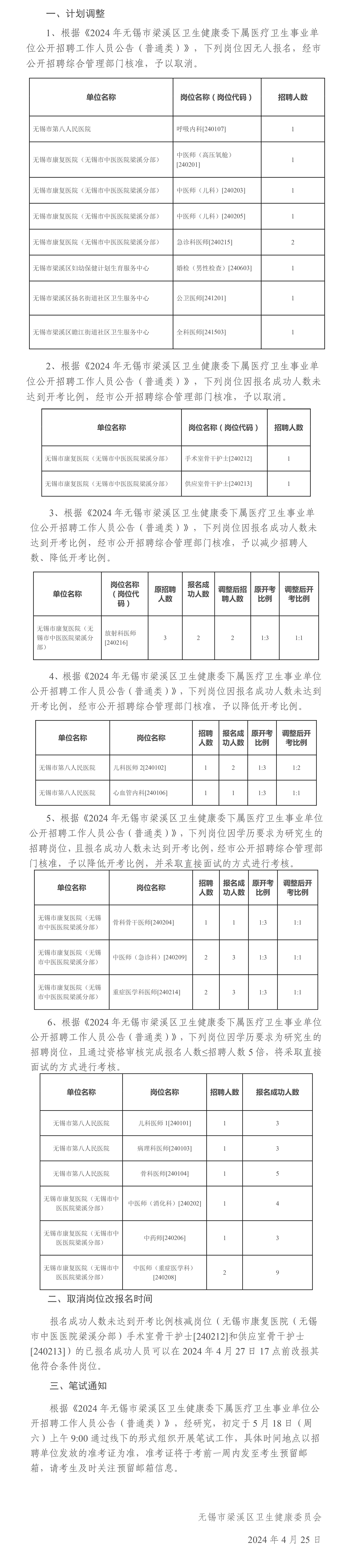 2024年无锡市梁溪区卫生健康委下属医疗卫生事业单位公开招聘工作人员(普通类)计划调整及笔试公告